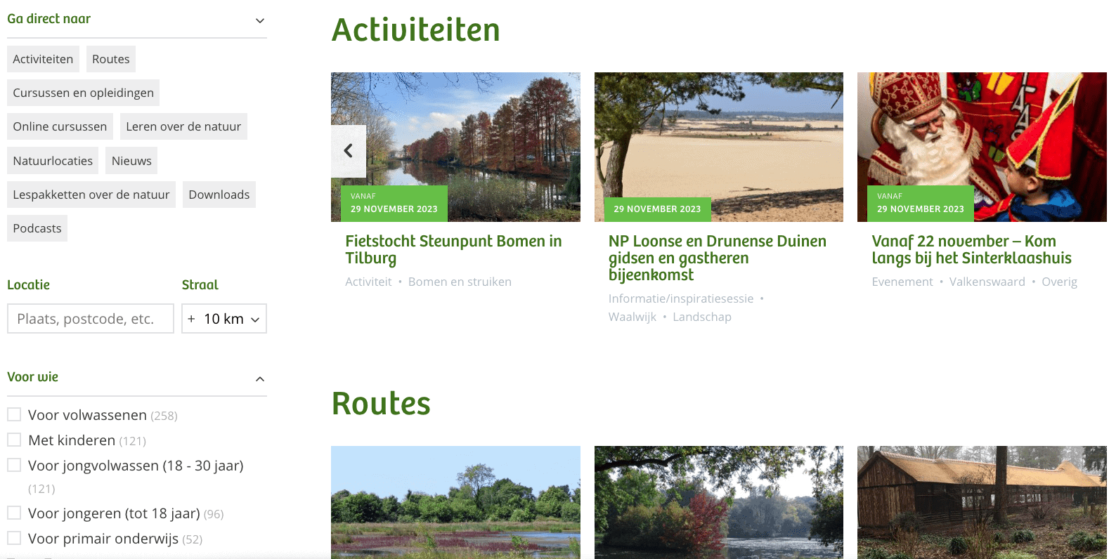 De vraagstelling van bezoekers op ivn.nl is zeer divers. Net als de doelgroep. Daarnaast heeft IVN een groot aanbod aan content, producten en diensten. Niet alle vragen laten zich vangen in een navigatiestructuur. En niet alle bezoekers nemen de moeite om de navigatiestructuur te volgen. Om dedoelgroep centraal te stellen en een intuïtieve gebruikerservaring te bieden, zijn geavanceerde zoek- en filterfunctionaliteiten ontwikkeld. De bezoeker geeft een zoekterm in in de natuurzoeker op de homepage waarna hij een overzicht krijgt met resultaten. De gedetailleerde filters laten de bezoeker snel en efficiënt de gewenste resultaten vinden. Deze filters zijn veelzijdig en omvatten categorieën zoals content type, afdeling, doelgroep en locatie.