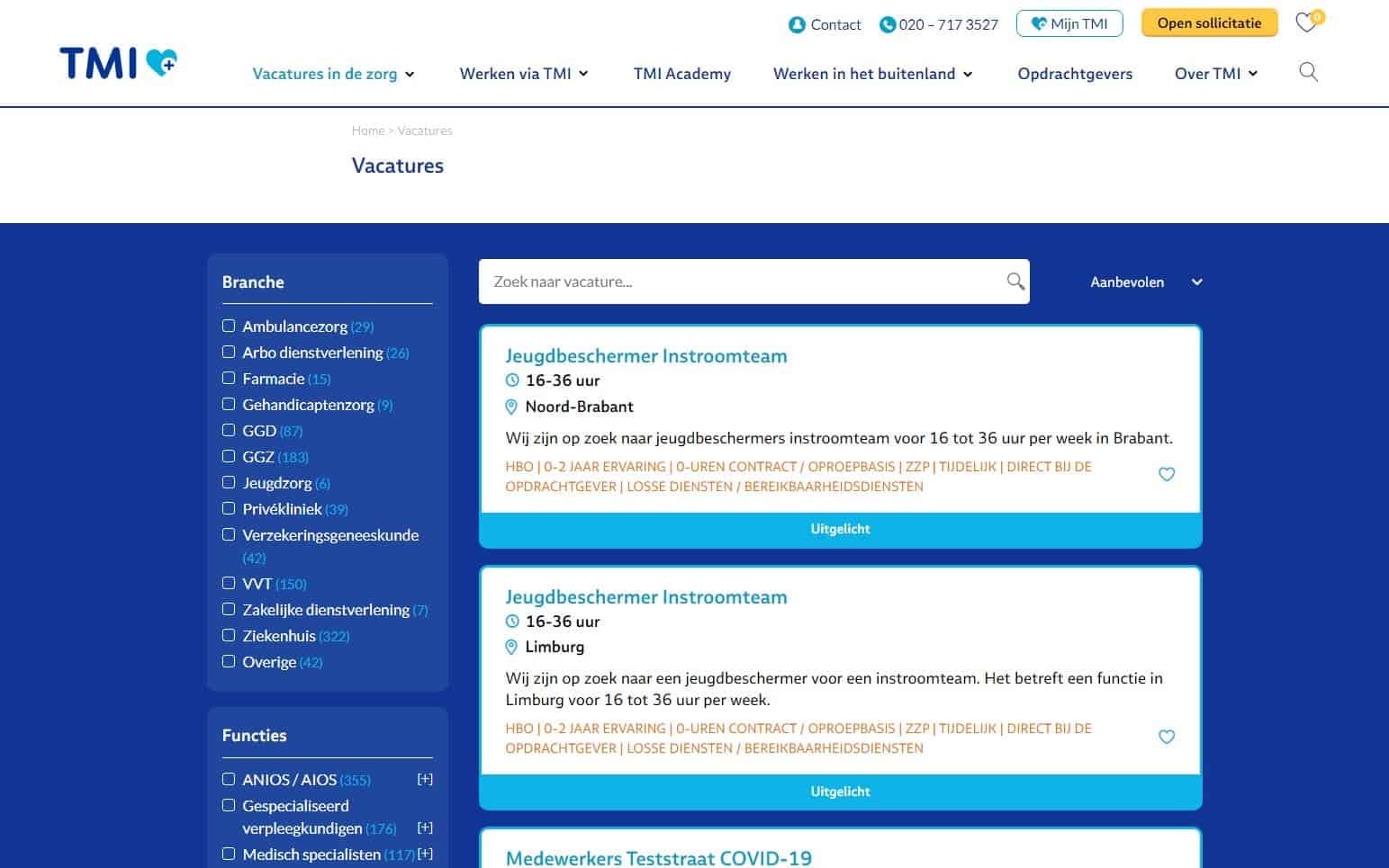 Met ruim 1.000 vacatures op de site is het belangrijk dat bezoekers eenvoudig een selectie kunnen maken van de vacatures die voor hen relevant zijn. We implementeerden daar een zoek- en filtersysteem voor dat grotendeels door de API-koppeling wordt gevuld. Bezoekers kunnen filteren op bijvoorbeeld branche, functiegroep, functie, soort dienstverband en regio.